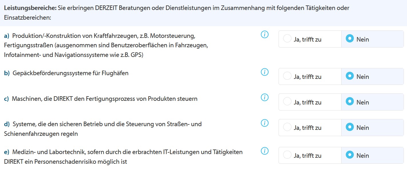 Im letzten Schritt werden Ihnen einige Fragen, die sogenannten Risikofragen gestellt, die Sie mit „Ja“ oder „Nein“ beantworten müssen. Diese unterscheiden sich je nach Berufsfeld und fragen spezifische und in der Regel besondere Risiken ab, welche dann zu einer Prämienerhöhung, zusätzlichen Vereinbarungen und im Ausnahmefall zur Ablehnung des Antrags führen können. Wenn Sie beispielsweise Ihren Onlineshop absichern wollen, werden Sie hier danach gefragt, ob Sie bestimmte Produkte verkaufen; wollen Sie eine IT-Haftpflicht abschliessen, werden bestimmte Beratungen und Dienstleistungen abgefragt. Sollten Sie eine dieser Fragen mit „Ja“ beantworten müssen, können Sie Ihren Antrag dennoch online stellen, der Vertrag kann lediglich nicht sofort aktiviert werden. In diesem Fall wird sich einer unserer Versicherungsexperten telefonisch mit Ihnen in Verbindung setzen, um Ihnen eine individuell auf Ihre Risiken abgestimmte Absicherung anzubieten.