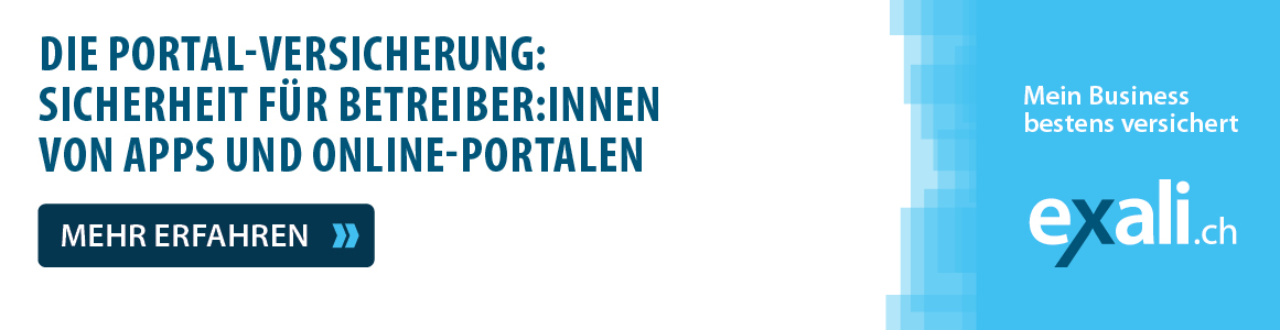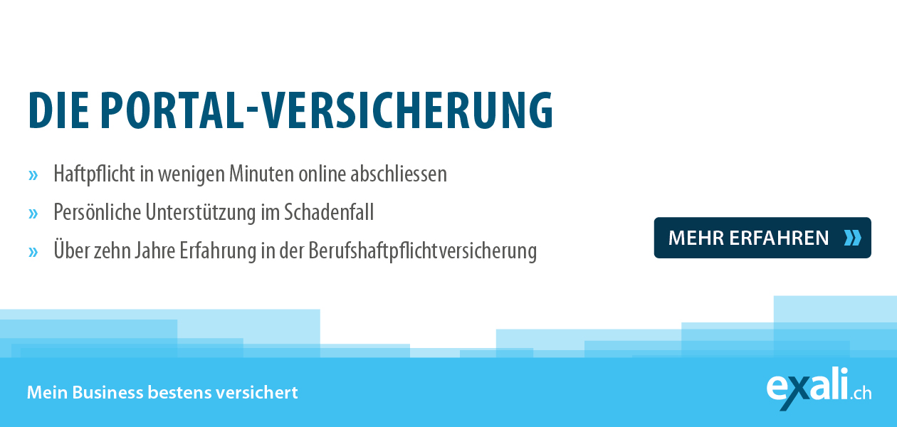 Dagegen sichert die Portal-Versicherung über exali Sie ab. Bereits der Basisschutz enthält einen umfassenden Schutz vor Vermögensschäden sowie die Absicherung von Personen- und Sachschäden in Form einer Büro- und Betriebshaftpflicht. Stellen Dritte Ansprüche an Sie, werden diese vom Versicherer geprüft und übernommen, sofern sie berechtigt sind. Erweisen sich die Forderungen jedoch als überzogen, wehrt er sie in Ihrem Namen ab. Bei Fragen stehen Ihnen unsere Expertinnen und Experten im Kundenservice unter +41 (0) 58 255 60 00 von Montag bis Freitag von 9:00 Uhr bis 18:00 Uhr gern zur Seite. Oder Sie nutzen ganz einfach unser Kontaktformular.